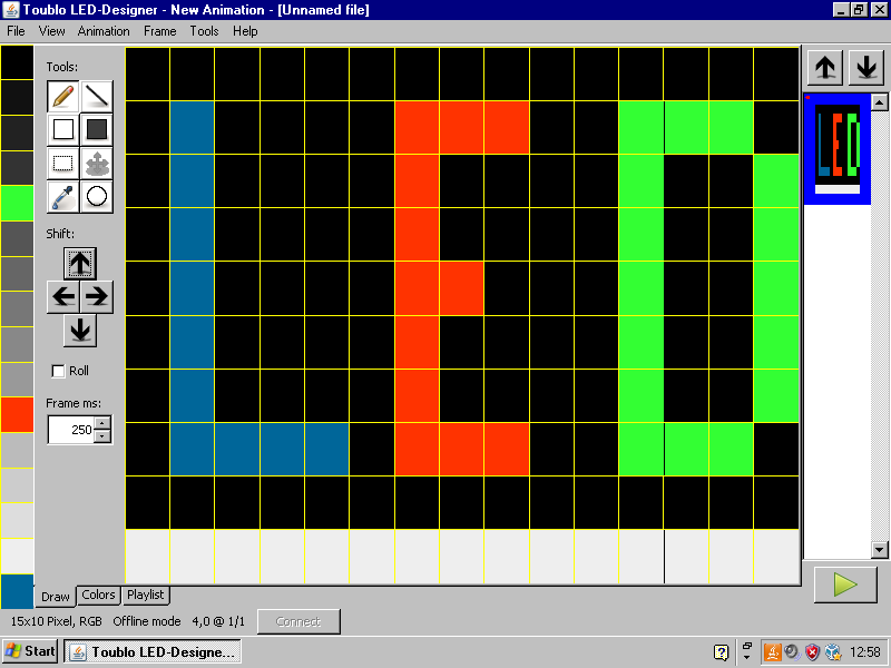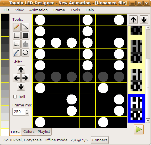 Toublo Ist ein einfacher Bild- und Animationseditor der speziell für LED-Displays entwickelt wurde. Am Besten lässt sich Toublo mit LED-Displays niedriger Auflösung einsetzen, ein praktisches Größenlinit ist aber nicht vorhanden. Einzelbilder können Pixelweise oder mit einfachen 2D-Zeichenwerkzeugen gemalt werden und Frame für Frame zu einer Animation zusammengesetzt werden. Toublo unterstützt einige Protokolle über LEDBrdgde. Eigene Protokolle lassen sich in ToubloScript (basierend auf Javascript) implementieren.