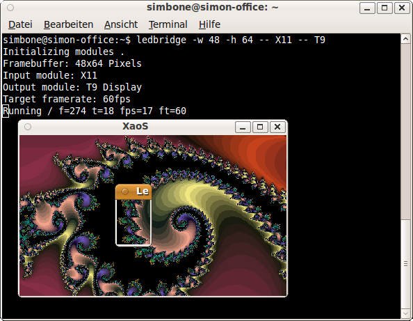 In dem Screenshot nimmt LEDBridge einen 48x64 Pixel großen Bereich vom Bildschirm auf, hier ein von XaoS erzeugtes Fraktal, und überträgt es auf einen T9 Display an eth0 (Standard-Schnittstelle).