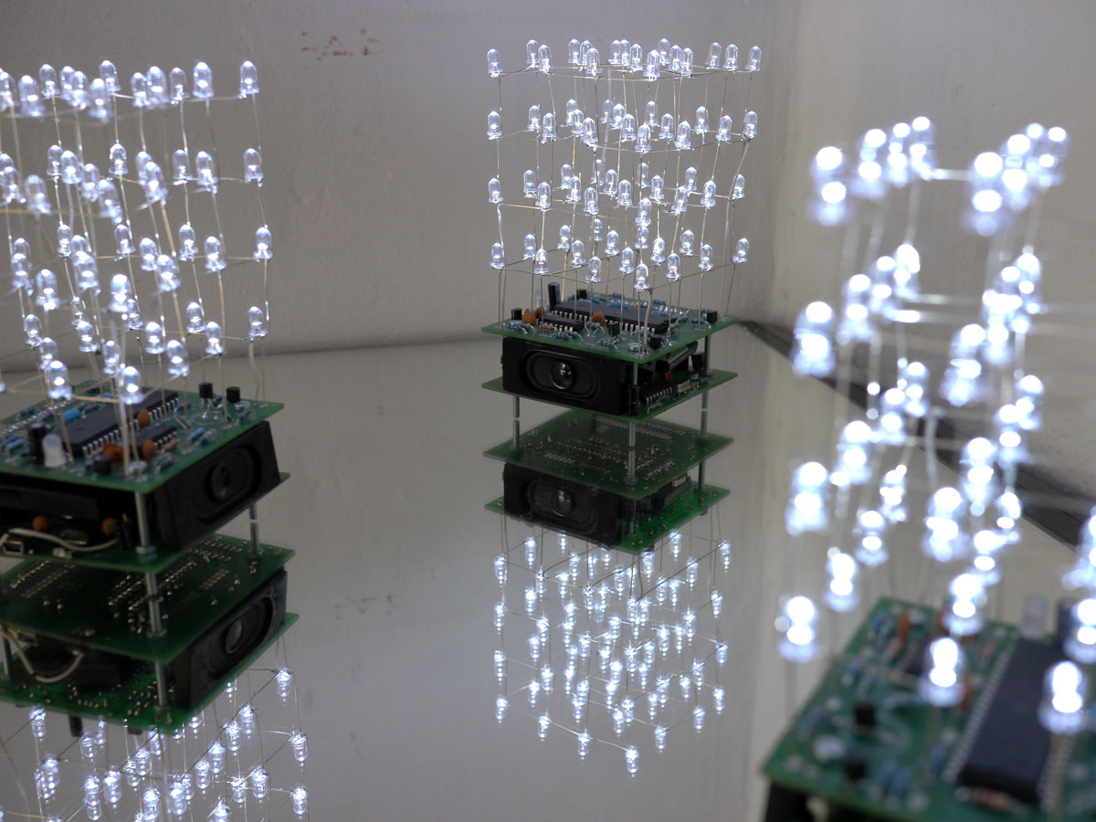 SwarmCubes Q202 Atelierrundgang 2012, Wien 20.-22. April 2012„In jedem Stadium entsteht die Welt, die wir wahrnehmen, durch »Emergenz«. Das heißt durch den Prozeß, bei dem beträchtliche Aggregationen von Materie spontan Eigenschaften entwickeln können, die für die einfacheren Einheiten, aus denen sie bestehen, keine Bedeutung haben. – Eine Zelle ist noch kein Tiger. Ebensowenig ist ein einzelnes Goldatom gelb und glänzend.“ (Philip W. Anderson) Ein dreidimensionaler Würfel aus Licht, der sich in ständiger Wandlung von Helligkeit, Zeit und Rhythmus befindet. Über einen Lautsprecher und einem Mikrophon, der “Kommunikationsebene” kann er Töne und einfache Melodien von sich geben und auch darauf reagieren. Ein einzelner Swarm Cube ist fremdgesteuert, d.h. wir “Erbauer” können mittels Computer oder Handy den Cube kontrollieren und ihm Verhaltensinstruktionen geben. In einem Kollektiv von SWARMCUBES jedoch entwickelt sich ein emergentes System, ein Prozess autonomer Kommunikation und Lichtbewegungen. Je größer die Anzahl der Swarm Cubes desto einzigartiger wird die kinetische Lichtskulptur, desto selbstorganisierter die Veränderung von Zuständen. Materialien und Technologien: |