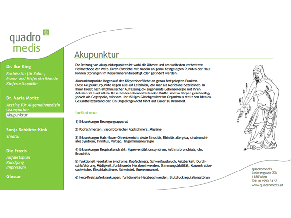 Quadromedis Webseite für die Gemeinschaftspraxis QuadromedisWebseite für die Gemeinschaftspraxis Quadromedis HTML , Gestaltung | 31 January, 2008 - 00:00 | nora |