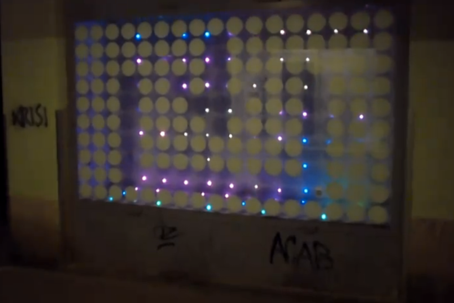 Öffentliche Installation im Durchgang Odeongasse - Zirkusgasse im 2. Wiener Gemeindebezirk. Geht jemand an der Installation vorbei, lacht ein Smiley der Person entgegen. Das Display wirdvon drei verketteten AurinkoLink-Controller gesteuert. Der Durchschnittsverbrauch ist ca. 3 Watt.