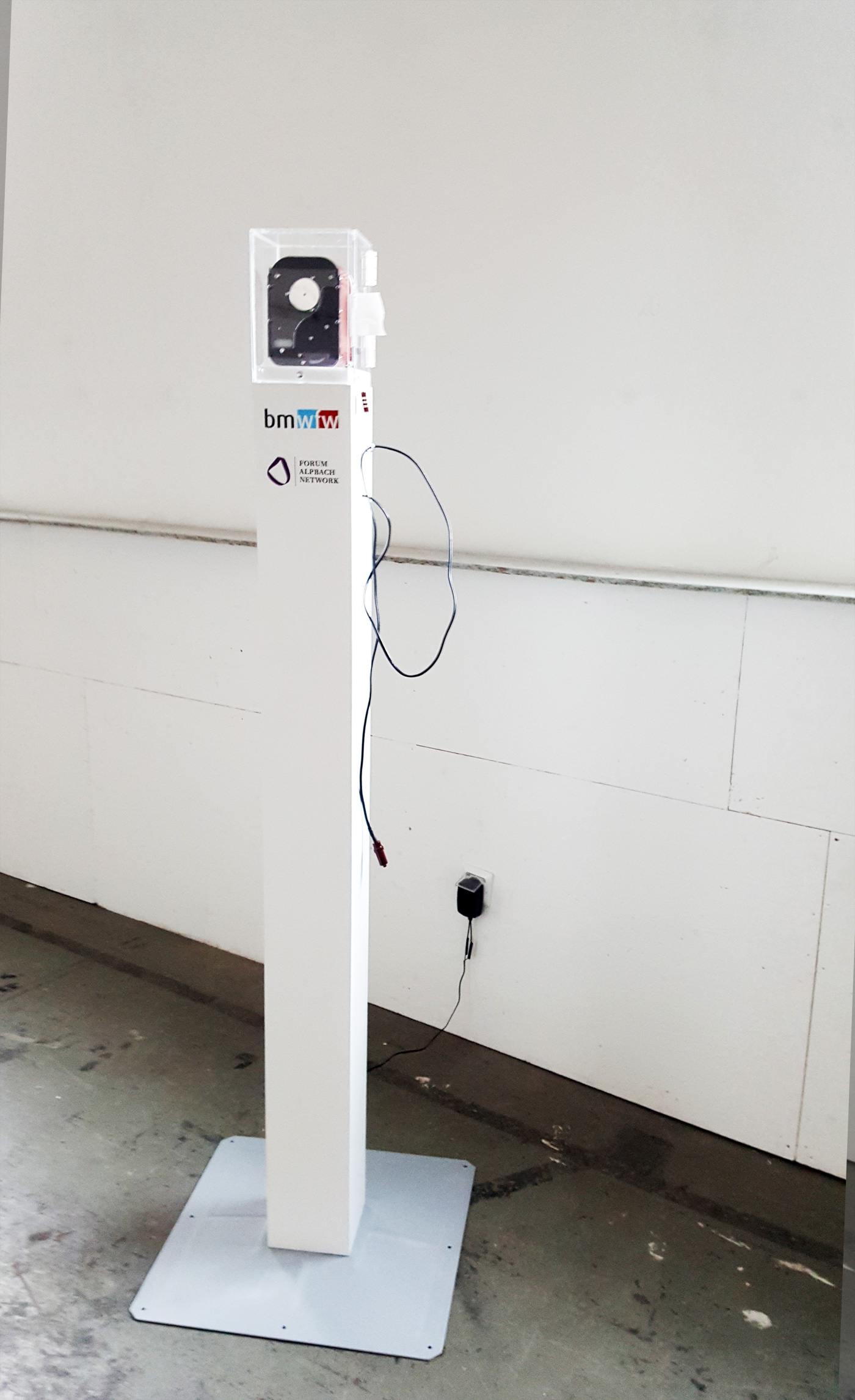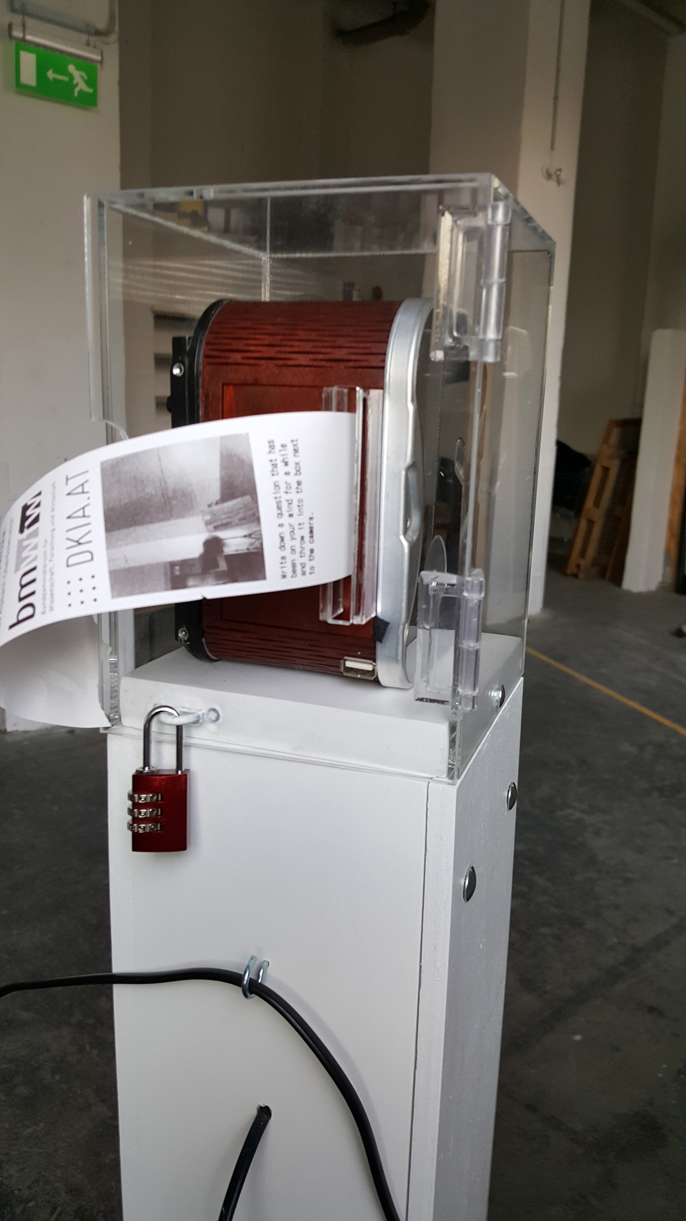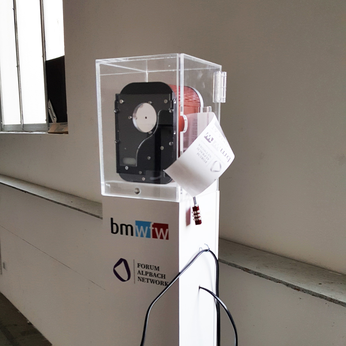 We constructed a second Polatherm (instant camera) with a wooden podest and an acrylic cover for the European Forum Alpbach in cooperation with Happylab, Vienna, the Club Alpbach Oberösterreich and the Federal Ministry for Science, Research and Economy, The installation is 1.50 meters high and consists of three parts, which can be plugged together. It was used in Alpbach as an "innovatition apparatus" and has printed fotos with instructions about innovations.