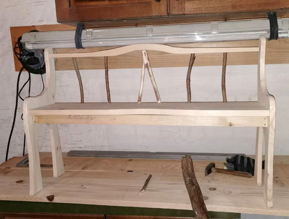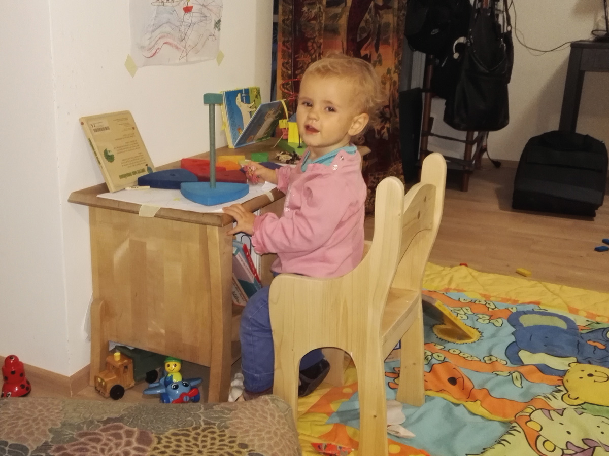 Im Sommer 2017 habe ich den ersten Kinderstuhl für meine Tochter Caroline gebaut, nachdem sie auf sämtliche Möbel, besonders auf meinen Schreibtisch kletterte. Nun hat sie ihren eigenen Schreibtisch mit eigenen Stuhl :-) Den Stuhl habe ich nach Augenmaß konstruiert, das Fichtenbrett habe ich in unserer Werkstatt gefunden, mir eine mögliche Form ausgedacht und mittels Stichsäge, Holzdübel und Leim gefertig. Er passt nach wie vor, auch für eine Vierjährige. Nachdem wir nach Eggenburg in unser Haus umgezogen sind und wir mittlerweile eine Werkstatt aufgebaut haben, lassen sich Möbel und andere Konstruktionen noch leichter realisieren.