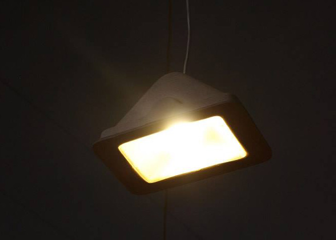From used cardboard corners in combination with 5 W LEDs, this functional 5-piece table lamp KLEDLA was created. It currently illuminated the dining and working table of the art gallery Kunstkanal .