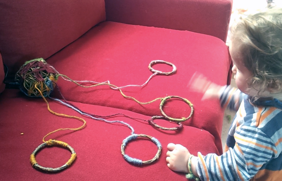 What can I bring my eleven month old niece Emma? After some considerations I came up with the idea of "Emmatone", a small electronic music instrument. From willow branches I have braided five round rings, wrapped them with a conductive thread which is connected to a small controller board. The controller board is connected to a loudspeaker and a power supply. Each of the five willow rings are associated with different piano sounds, so playful small compositions and melodies can be created by touching the rings.