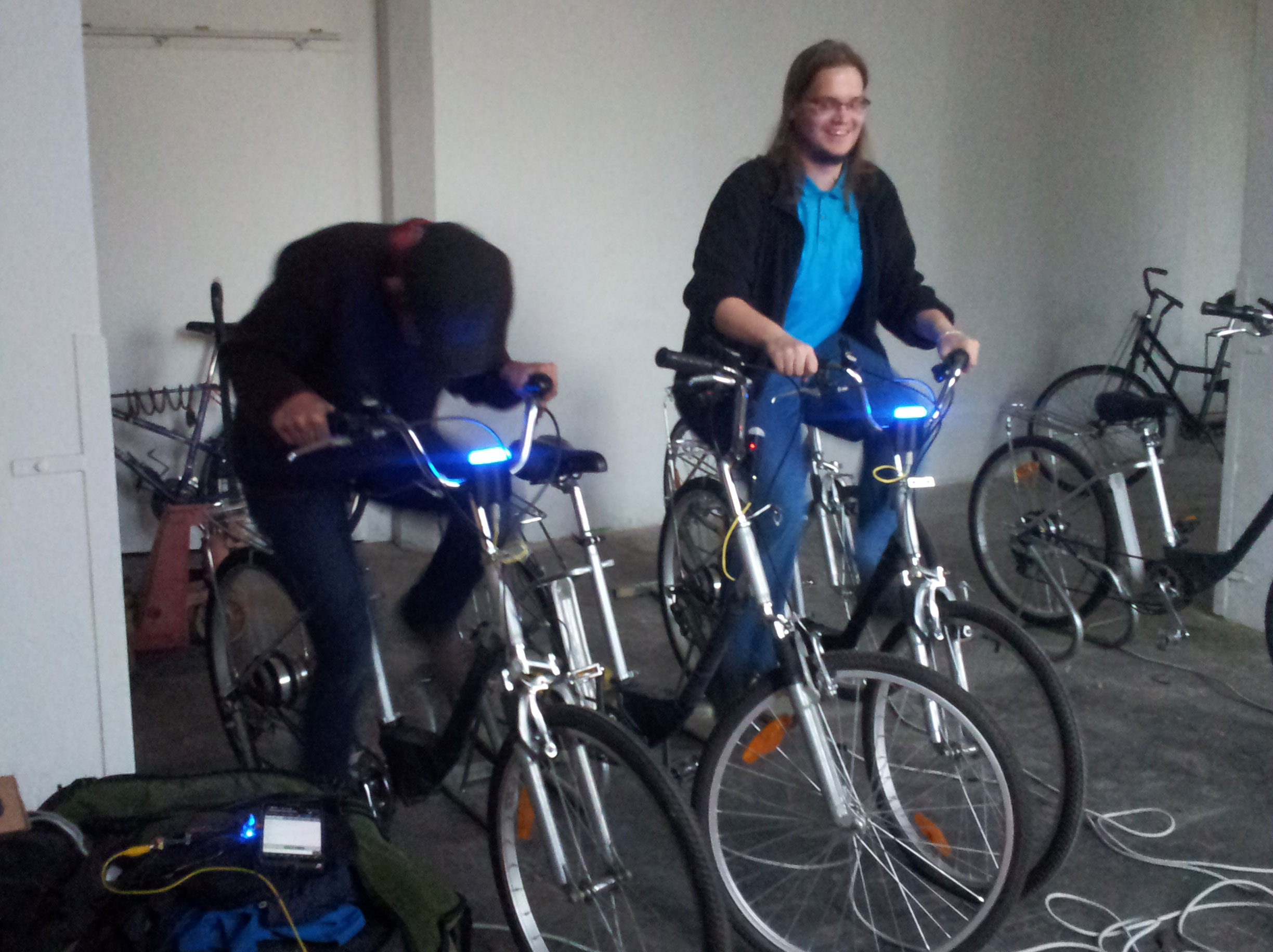 Wir haben ein neues Lichtsystem für den CycleCinemaClub entwickelt. Jedes der stromproduzierenden Fahrräder wird mit einem intelligenten Lichtsystem ausgestattet, welches die produzierte Leistung (0 - 120 Watt) farbig anzeigt. Die Leistung wird über ein Funkmodul an ein LED Display gesendet, welches die Gesamtleistung des produzierten Stroms von 5 - 6 Fahrrädern visualisieren wird. In den aus PLA 3D gedruckten Gehäusen sind jeweils 8 RGB LEDs, ein Iteaduino Lite und ein Funkboard untergebracht. Das Display für die Gesamtleistung wird mit den RGB Ledstripes WS2812 angefertigt.