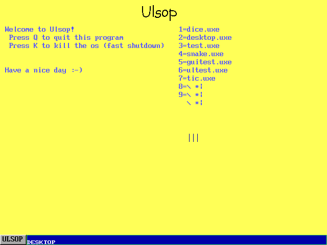 OSLOADER.UXE will then start all the autostart programs specified in ULSOP.INI (for now just a rudimentary desktop called DESKTOP.UXE) and terminate itself.