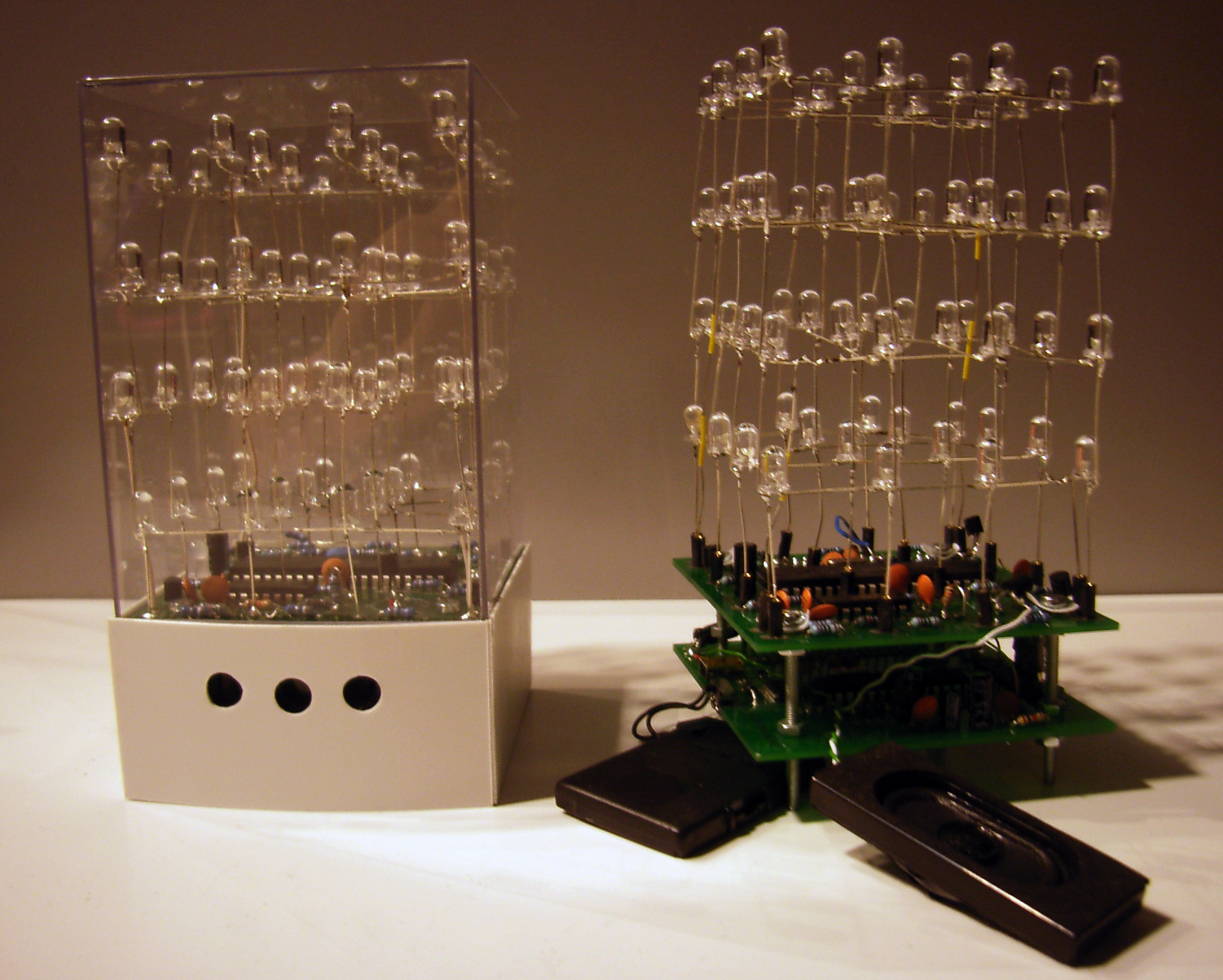 The LEDs of the cube are connected to the top board, which also contains the system processor (ATMega32) and the audio playback circuitry. When power is switched on, first the system processor on the top board takes control and keeps the Arduino in permanent reset. If a computer attached via USB starts talking to the board using the right protocol the computer can control the Cube by completely bypassing the Arduino chip. If no computer is detected – or a “wrong” byte is received the Arduino is woken up and control passed onto it. Communication between the Arduino chip on the lower board and the system chip on the upper board is perfomed using SPI (Serial peripheral interface). This just uses very few pins on the Arduino. An Arduino-library has been developed to simplify using this interface.