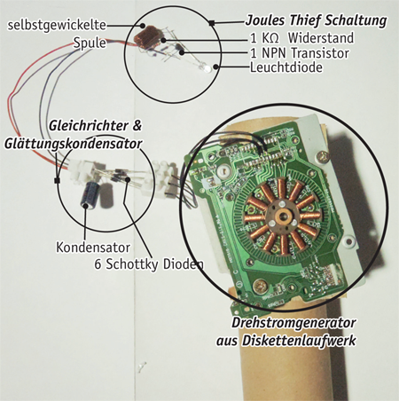 Es gibt die Möglichkeit die Spannung mittels einer Joules Thief Schaltung zu erhöhen. Für diese Joule Thief Schaltung müssen wir eine Spule selbst wickeln. Dazu nehmen wir einen Meter Kupferdraht, falten ihn in der Mitte, ziehen ihn straff und schneiden ihn an der gefalteten Seite durch. Nun haben wir 2 1/2 Meter Kupferdrahtstücke. Wir nennen sie A und B. Wir führen beide Kupferdrähte durch den Ferritkern und wickeln sie gespannt um den Ferritkern herum, bis beide Drähte aufgebraucht sind. Nun messen wir die Widerstände um zu erfahren welcher der Anschlüsse zu A und welche Anschlüsse zu B gehören. Wir verbinden den Draht A auf der linken Seite mit dem Draht B auf der rechten Seite. Dieser Verbindungspol wird an den Pluspol des Gleichrichters angeschlossen. Es bleiben jetzt noch zwei unangeschlossene Anschlüsse zurück. Wir nehmen einen davon und verbinden ihn über einen 1 KOhm Widerstand mit dem Basisanschluss eines NPN Transistors, den anderen Anschluss verbinden wir mit dem Kollektor des Transistors. Den Emitter des Transitors löten wir an den Minuspol des Gleichrichters. Nun löten wir noch die Leuchtdiode an den Transistor an. Die Kathode kommt an den Emitter und die Anode an den Kollektor.